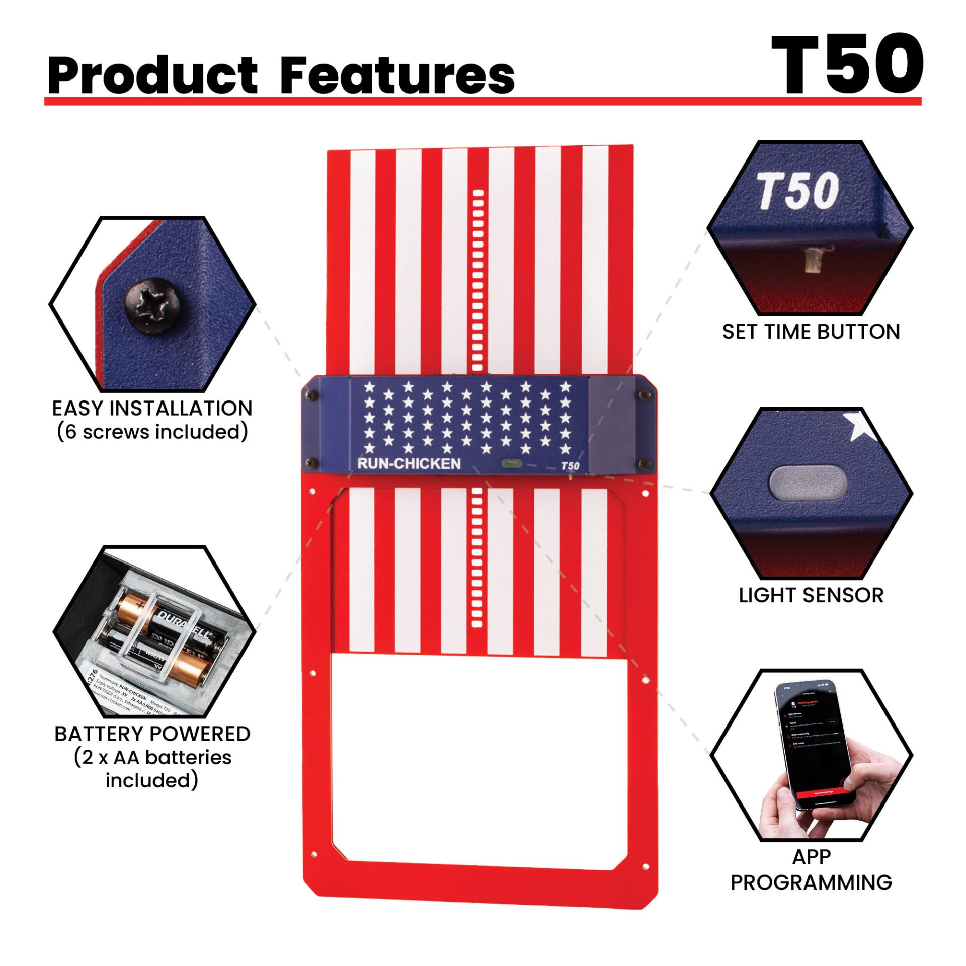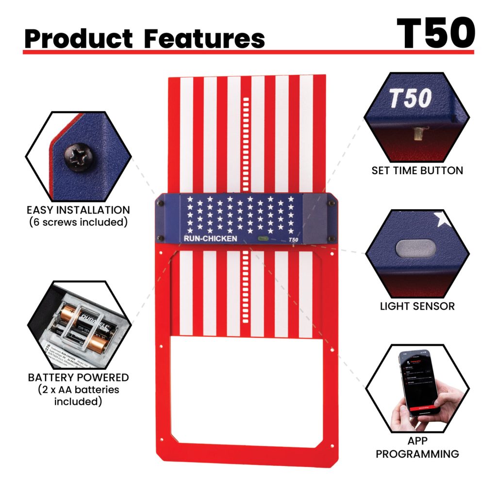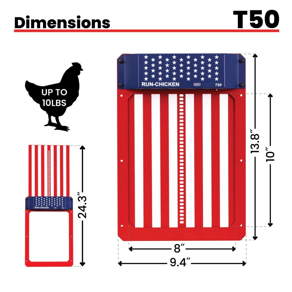 Collect your eggs without a care. The battery-powered RUN-CHICKEN T50 Automatic Coop Door saves you time and protects your chickens from the dangers of the wild. The RUN-CHICKEN Automatic Coop Door is designed to make your days easier and transform chicken raising into a happy, carefree activity.